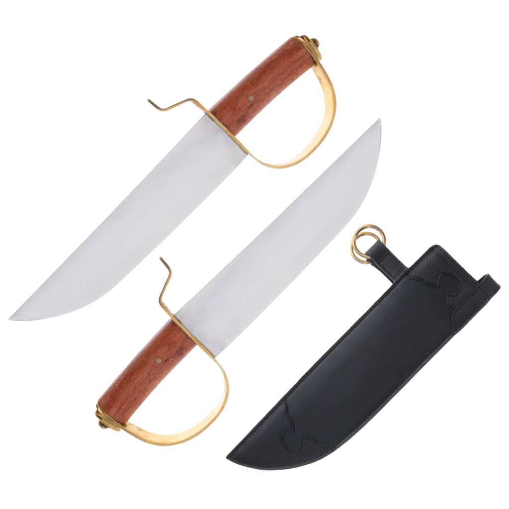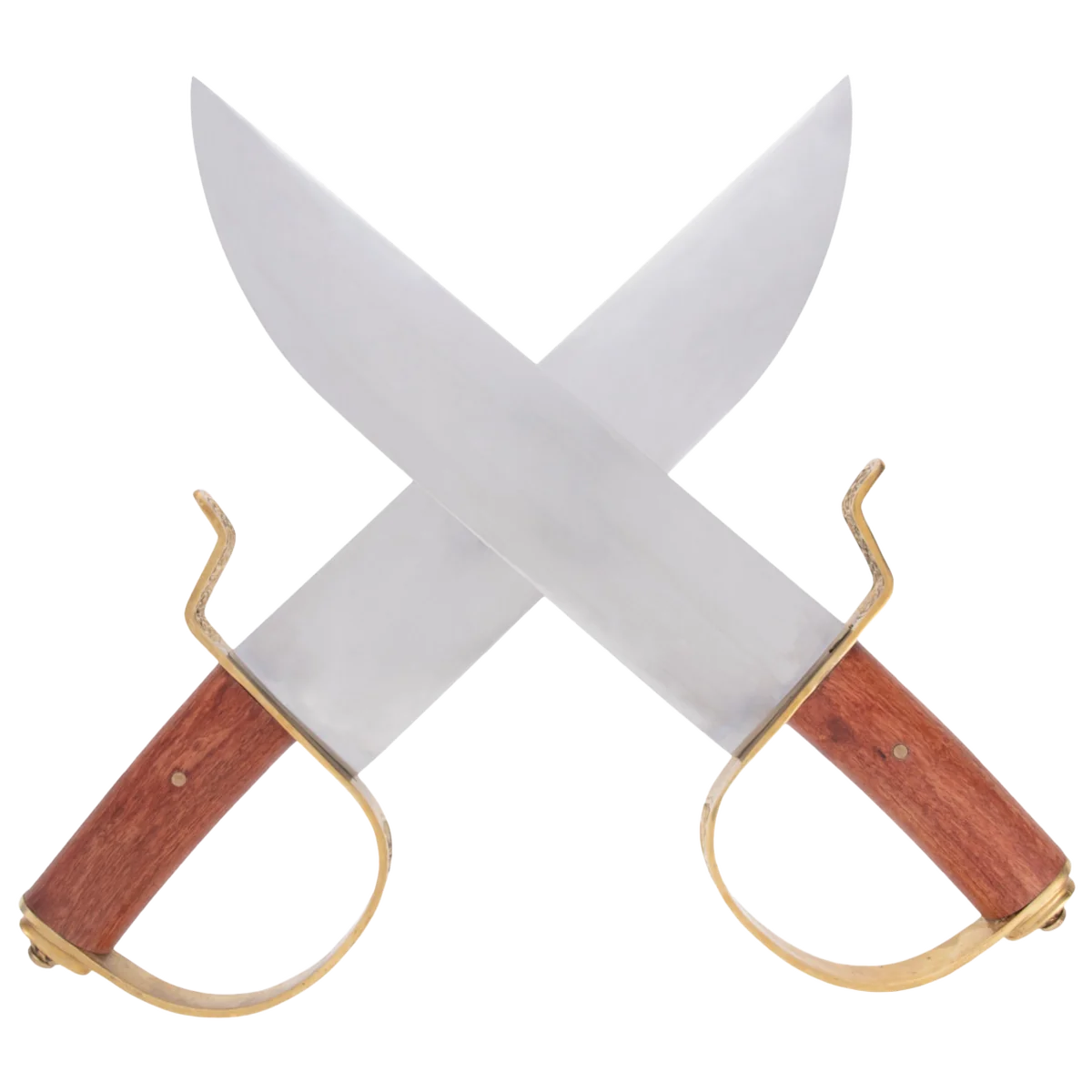 - 2X Full tang swords made from 1060 carbon steel with a mirror polish finish. Hardwood handles with a brass "D" shaped guard, also includes a leather sheath for transportation.