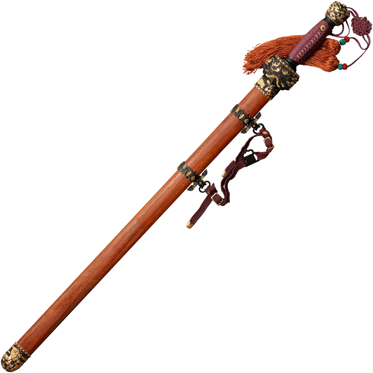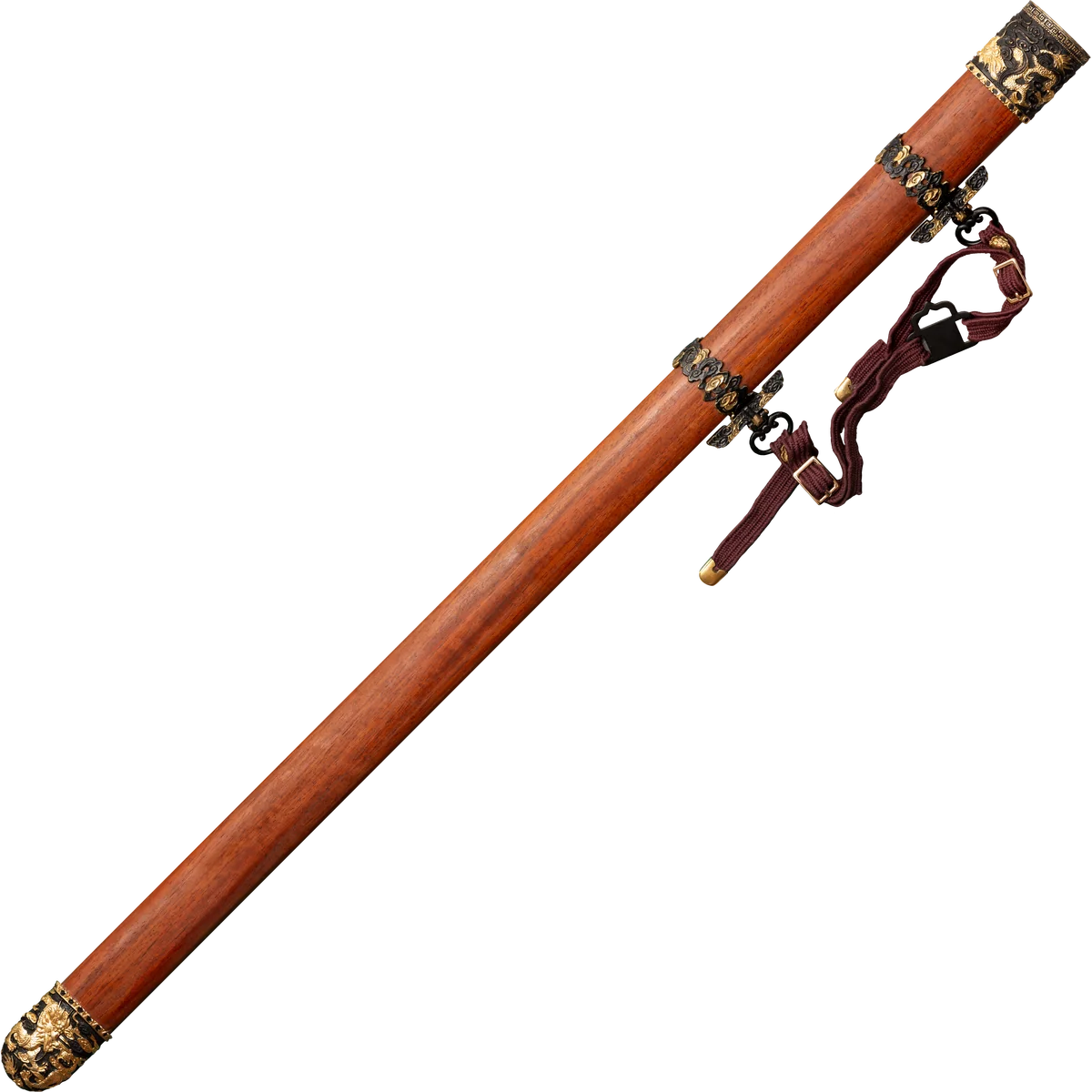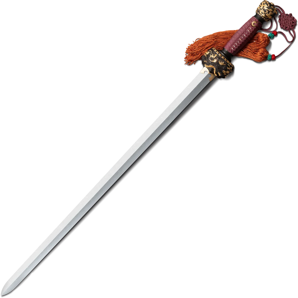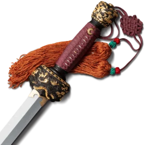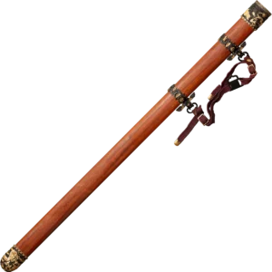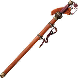 This is a traditional Chinese Gim, that’s styled for the imperial court! It's impressive and stunningly beautiful design is sure to impress even the most jaded aficionado. The blade is fashioned from a fine Damascus steel with a distinctive, and beguiling pattern. It is heat treated to a hard spring temper so that it will resist metal fatigue. The handle has a Rosewood core and is wrapped with silk cord. The guard and pommel are elegantly detailed with a traditional Chinese decorative motif. The scabbard is made from select Rosewood and is decoratively styled to complement the sword's grip.