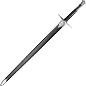 We would be hard pressed to think of a more versatile or effective sword than the "Bastard" or "Hand-and-a-Half Sword" we offer here. For a sword of this size, it's amazingly light and fast and tips the scales at approximately 3 lbs. Its 33 1/2" long blade is quite wide so it can produce deep shearing type cuts. Its long handle is suitable for both a one or two handed grip and is fashioned out of wood covered in black leather. To balance the long blade we have capped the butt with a beautiful "scent stopper" pommel which can be a lethal weapon in its own right.