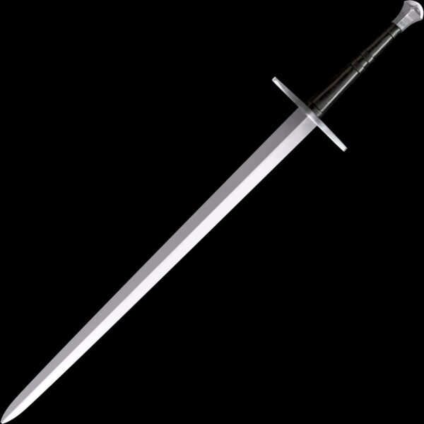 We would be hard pressed to think of a more versatile or effective sword than the "Bastard" or "Hand-and-a-Half Sword" we offer here. For a sword of this size, it's amazingly light and fast and tips the scales at approximately 3 lbs. Its 33 1/2" long blade is quite wide so it can produce deep shearing type cuts. Its long handle is suitable for both a one or two handed grip and is fashioned out of wood covered in black leather. To balance the long blade we have capped the butt with a beautiful "scent stopper" pommel which can be a lethal weapon in its own right.
