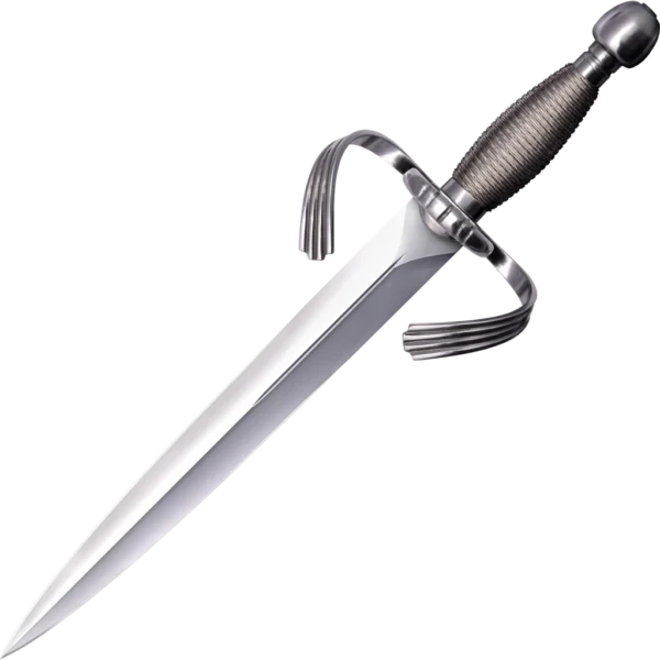 Right at home in any period between the 15th and 17th century our Large Parrying Dagger would be a prized possession worthy of being handed down through the generations. Easily wielded in any direction and with great speed it comes with a period correct wire wrapped handle and a strong steel pommel which easily doubles as an impact weapon in its own right, as well as sporting extra sturdy down turned quill ions and a generous side ring. Delivered fully polished, sharpened and encased in a thick black leather scabbard embellished with a decorative throat and shape it's the parrying dagger you have been waiting for as its advantages are undeniable.