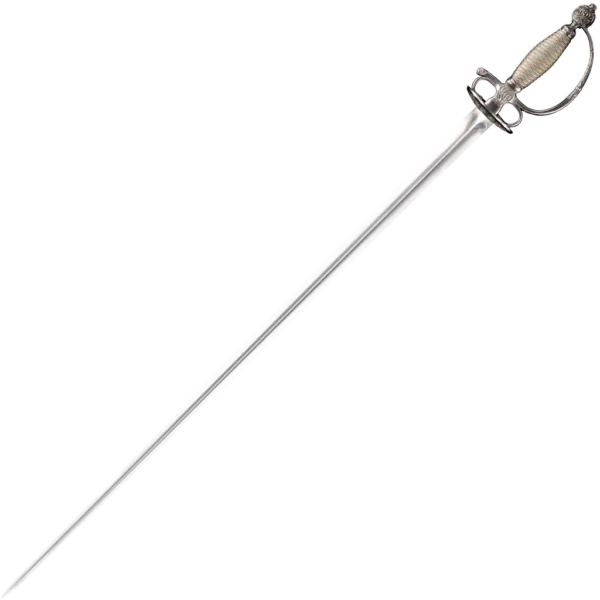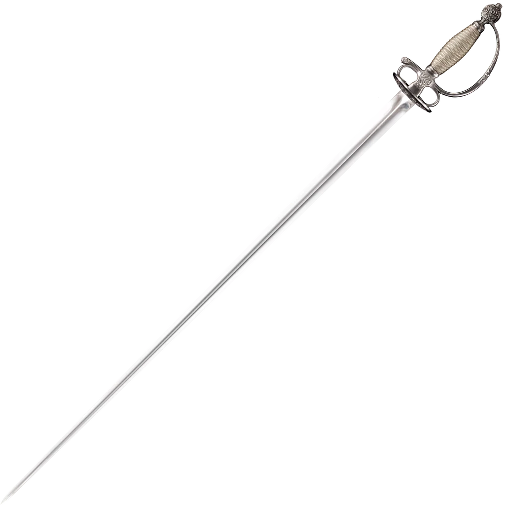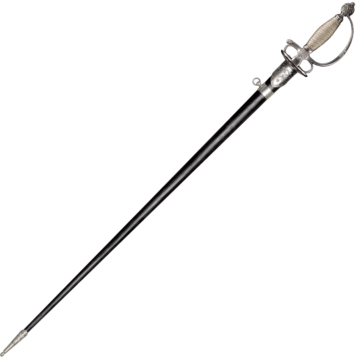 The advantage of the sword point over the edge became increasingly evident by the end of the 16th century. The Rapier, with its long, elegantly thin profile which emphasized its point, became the popular choice for civilians. It was however a somewhat unwieldy weapon especially when it was used in narrow, crowded streets and alleyways. Eventually a more sophisticated, shorter and lighter version emerged that by the end of the 17th century had evolved into an entirely new weapon, the Small Sword. The Cold Steel Small Sword duplicates the original model in weight, balance, triangular cross section, and sharp point, but uses modern materials like 1055 Carbon steel, heat treated to a tough spring temper. The hilt features two shells with functional finger loops and a light, but strong, knuckle guard. Perfectly balanced and weighing only 22 ounces, the Small Sword comes complete with an attractive leather scabbard that features an intricately decorated throat and chape.