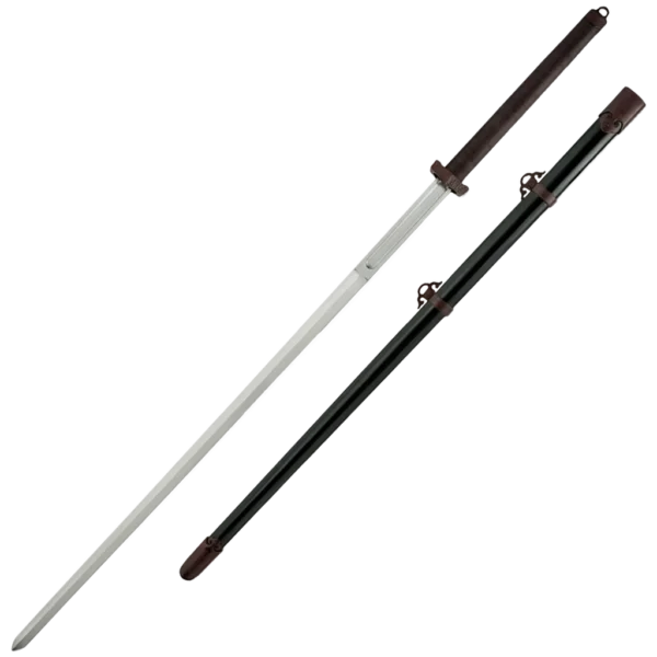 Rooted deeply in Chinese culture going back to the Neolithic age and first finding expression during the Shang and Zhou dynasties as a monster mask on bronze ritual vessels, the legend of the taotie still manifests in modern cutlery on eating utensils and plates. Punished by the gods for his overindulgence, as a warning to others the gods took away the body and jaw of TheTaotie (gluttonous monster) so all he could do was eat constantly, leaving nothing but a head and gaping mouth. The artisans of Dragon King conceived this new take on this ancient warning in the form of the Taotie Jian. The classic zoomorphic head motif is featured embossed on the pommel and the guard. The 37 3/4" blade's 7" ricasso (3/8" thick at base) reinforces the overall strength for powerful thrusts and blocks. The 12 1/2" wood core handle is pristinely thin cord wrapped which allows for an easy grip for a 51 1/2" long sword. A black lacquered scabbard with matching accents secures the sword.