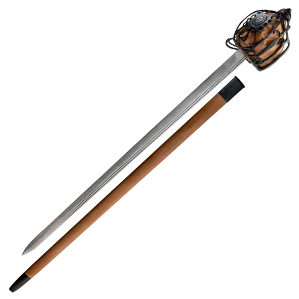 Early Scottish highland swords almost invariably carried the double-edged “broadsword” blade, but by the time of the Battle of Culloden (1746) the single-edged “backsword” was at least equal in popularity. Paul Chen's Basket-Hilt Backsword, replicated from an original sword in the collection of the Royal Armouries in England that dates from about 1760, has an unusual basket with twin engraved “horned beastie” plaques and a blade with twin fullers running most of its length. The blade is German in origin, but the hilt and blade are contemporary. This version of the sword features an antiqued finish. The hilt is crafted in stainless steel at Hanwei, to minimize maintenance, and is finished with a museum-quality patina. The high-carbon blade is also lightly “antiqued” to promote authenticity. The grip is covered with wire-wrapped genuine rayskin and the basket liner, like the original, is crafted in fabric-covered leather. The scabbard is leather-covered.