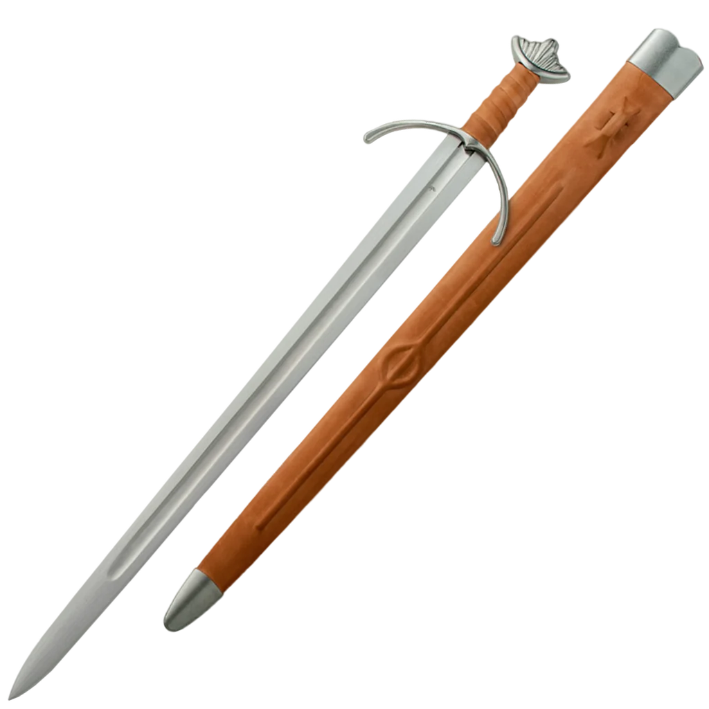 The celebrated Cawood Sword, named after its discovery location near Cawood Castle in England, is regarded as one of the finest and best-preserved examples of an 11th century Viking sword in existence. Hanwei’s version of the sword replicates the lobated pommel and steeply down-curved quillons of the hilt perfectly, while the wide-fullered blade is reproduced in 5160 high-carbon steel. The weight and balance provide for a very usable sword. The hard-core grip is overlaid with brown leather and has a steel throat and chape. No details of the original scabbard are known, but the styling of Hanwei’s matching leather-covered version is typical of the period. The beautiful scabbard is made from wood then wrapped in leather which features decorative elements and a solid steel end cap.