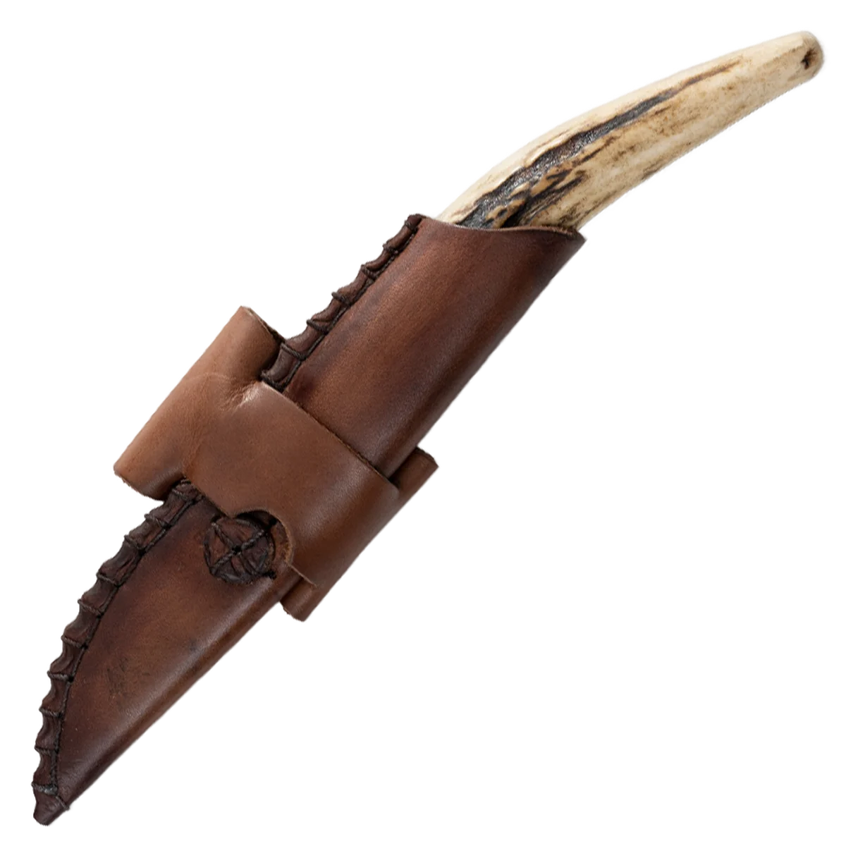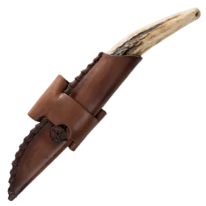 - This small scramasax is authentically hilted in stag and is equipped with a leather horizontal-carry sheath.