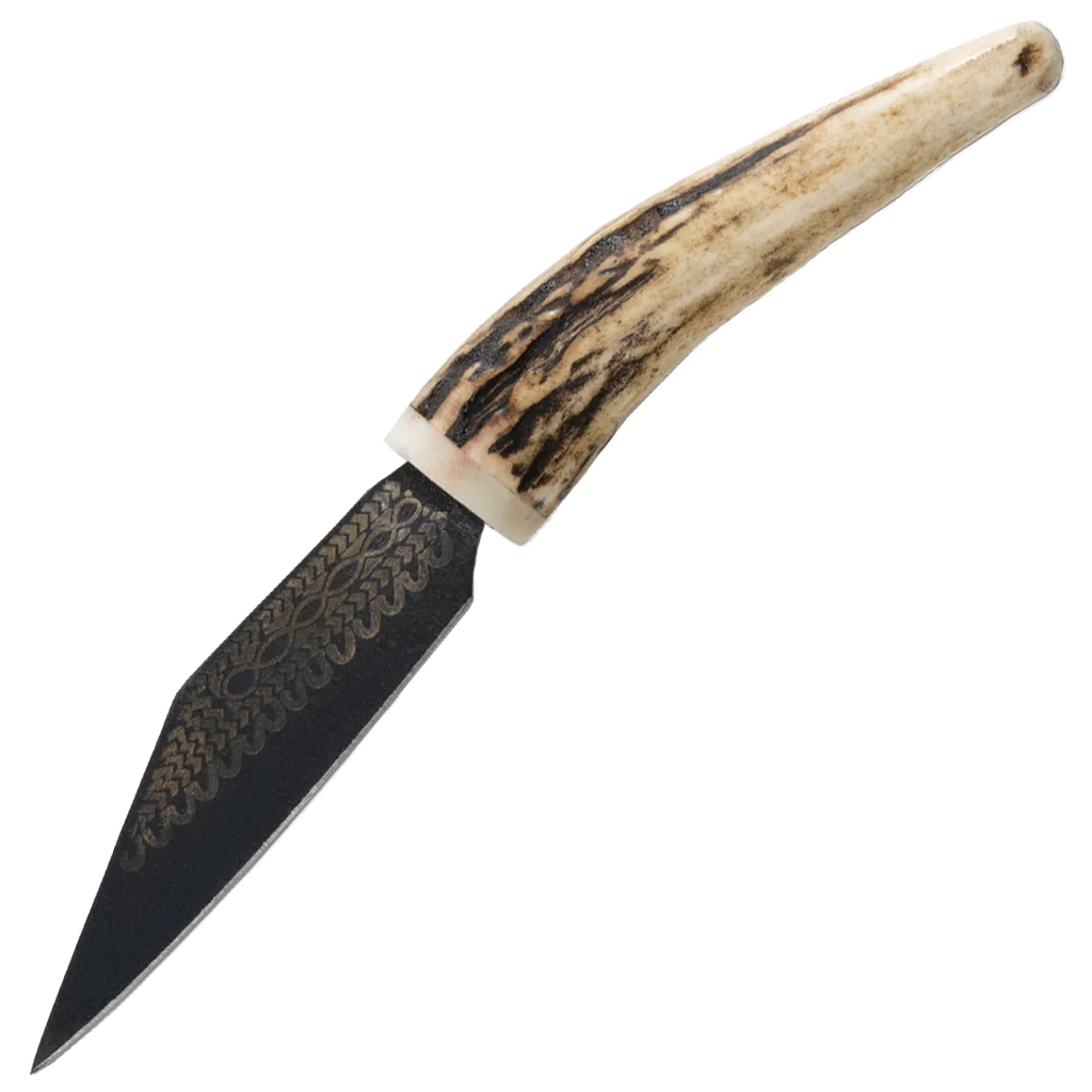 This Hanwei Viking Seax is sized just right to make it a ready and easily carried utility knife for everyday Viking chores and tasks. Carried horizontally at the back of the belt, the scramasax provided the spearman with both a close-quarters side arm and a tool and utensil in camp. The sharpened blade is crafted from tempered 65 Mn High Carbon Steel with antiqued finish and surface etchings done in the style of pattern welding. The blade is mounted into a grip crafted from stag horn.
