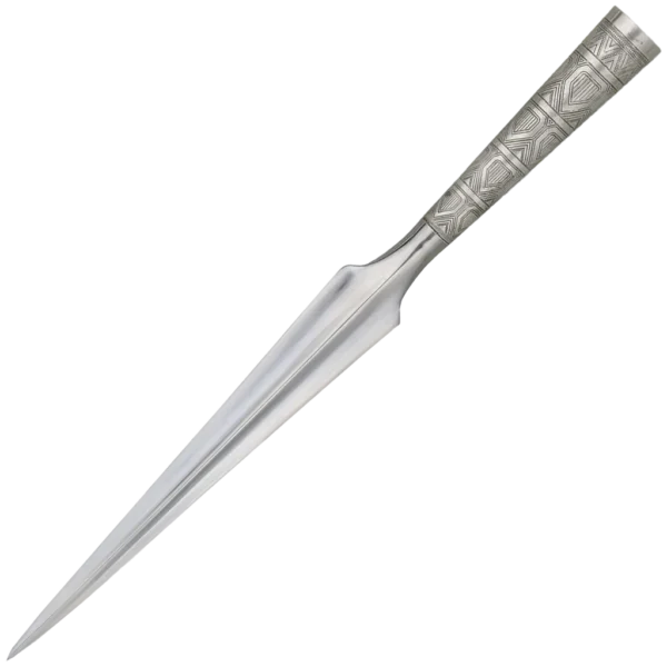 The decorated spearheads demonstrate the Viking’s creative use of intricate patterns, created using the “Niello” process. This involved using an alloy of several metals (notably silver) mixed with sulfur which was rubbed into an incised pattern and then fired. Where the alloy is rubbed into the engraving, it remains black while the rest of the surface is polished to a bright finish. Hanwei's decorating process provides a lustrous, permanent Niello-like effect. Each spearhead has a shaft diameter of 1”. Spearheads only are supplied. Note: This spear head is cast hollow, and therefore not suitable for functional use. It is ideal, however for re-enactment/living history costuming and displaying.