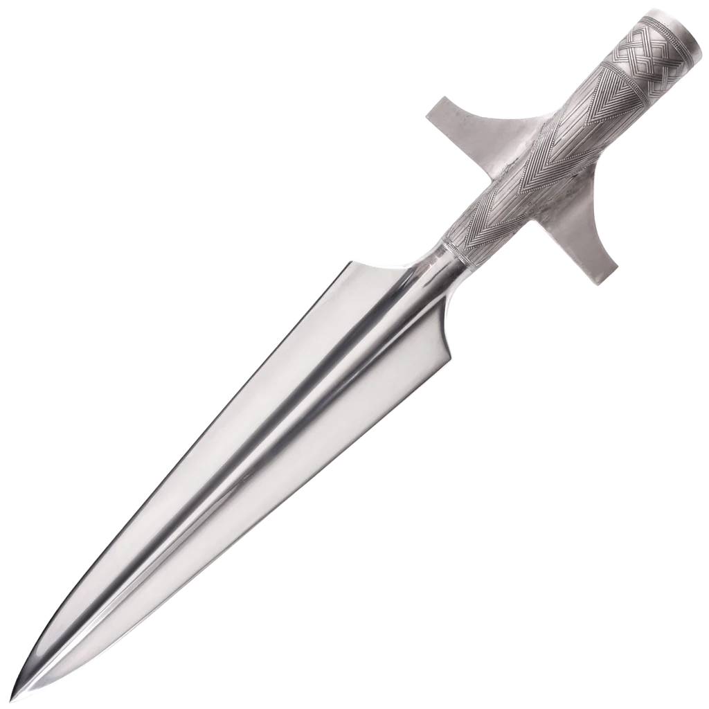 The decorated spearheads demonstrate the Viking’s creative use of intricate patterns, created using the “Niello” process. This involved using an alloy of several metals (notably silver) mixed with sulfur which was rubbed into an incised pattern and then fired. Where the alloy is rubbed into the engraving, it remains black while the rest of the surface is polished to a bright finish. Hanwei's decorating process provides a lustrous, permanent Niello-like effect. Each spearhead has a shaft diameter of 1”. Spearheads only are supplied. Note: This spear head is cast hollow, and therefore not suitable for functional use. It is ideal, however for re-enactment/living history costuming and displaying.