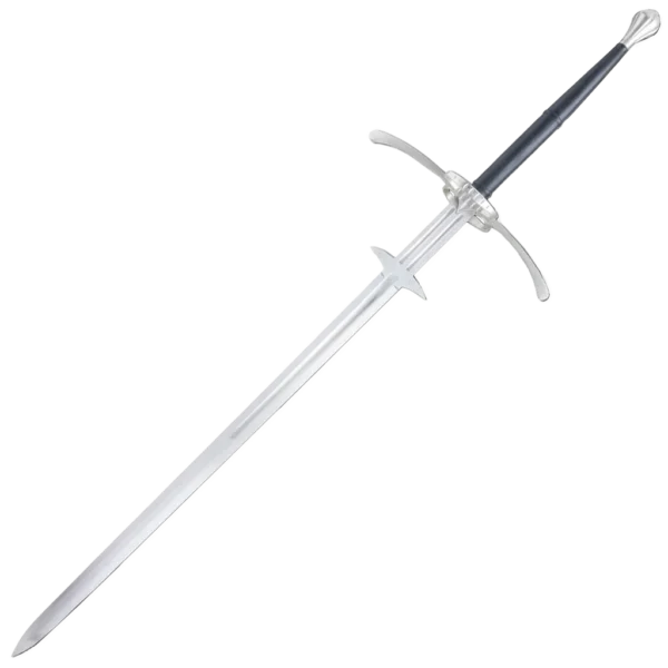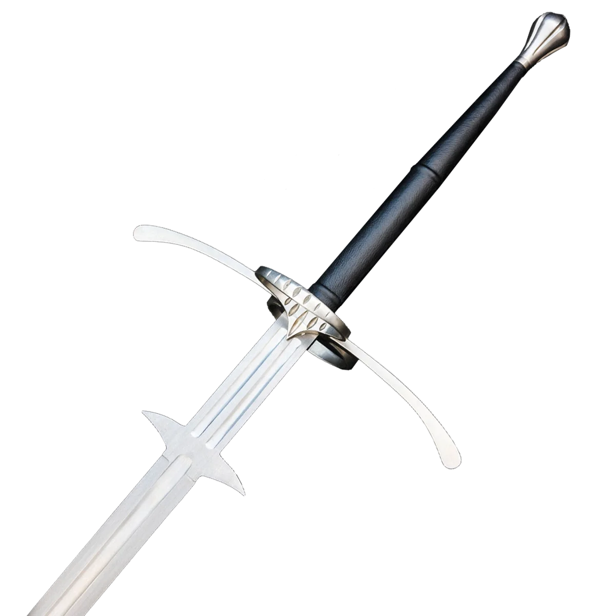 The Great Sword is a long versatile two-handed blade, developed for powerful cuts and thrusts. The double-edged straight blade featured a flattened ricasso that allowed the swordsman to choke up on the blade for more control, dexterity and maneuverability in close quarters. The parrying hooks at the end of the ricasso kept the user’s hand from slipping onto the blade and catching blades or pole-arm shafts. Designed by CAS founder Barry Ross, the Kingston Arms Great Sword embodies all the attributes a sword aficionado would want in such a piece. At 56.25" long and weighing a 5 lbs., it falls within the parameters found in great swords of the period. The 39.5" blade has a 5.5" double grooved ricasso with 1.5" parrying hooks and a 14.25" blade fuller. The 16" handle features a 12.75" leather wrapped grip for easy handling and carrying over the shoulder. The double ringed, stainless-steel guard and pommel are a matte finish. From tip to tip, the guard is 15" wide with tapering 12.5mm thick quillions. With a balance point of 3" from the guard and a point of harmonics 19” from the tip, the Great Sword is beautifully balanced and highly functional.