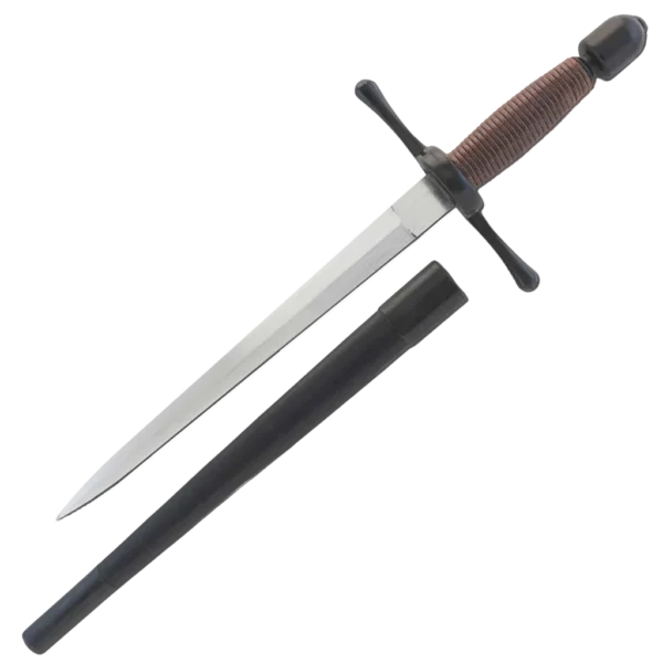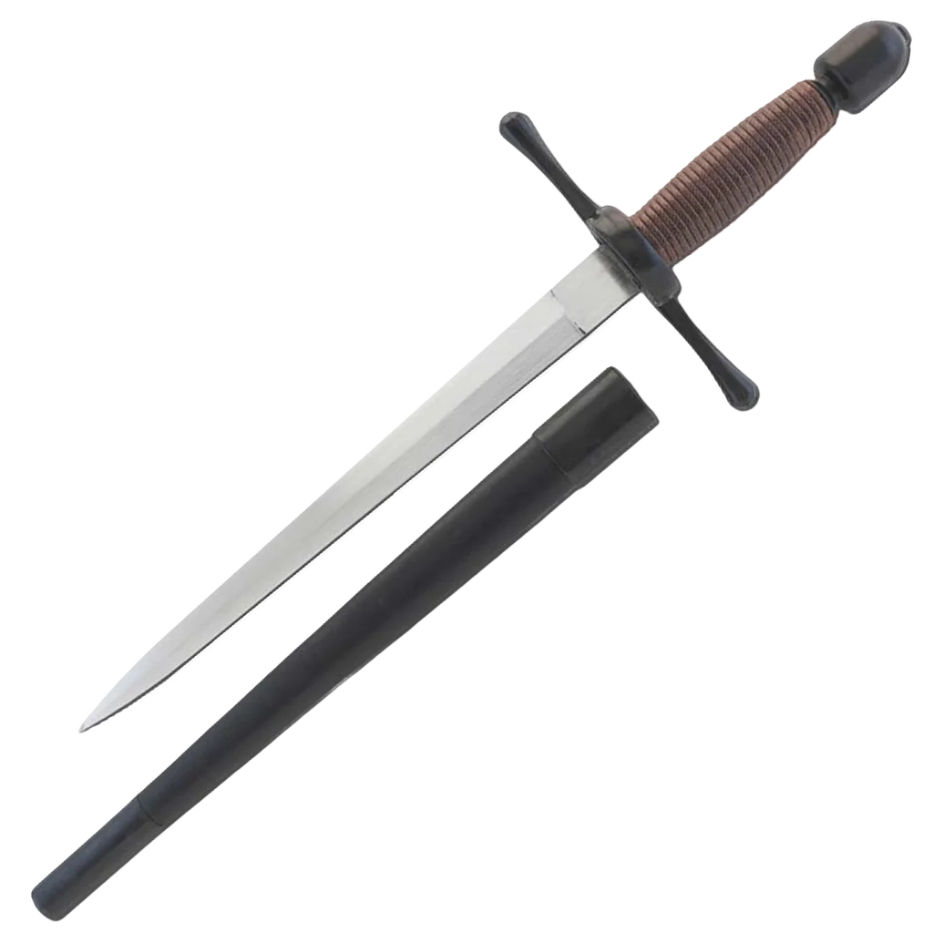 The Main Gauche, or left hand dagger, was often used with the rapier, providing an added dimension in both offense and defense, and the “Schools of Fence” which proliferated in Europe during this period taught the use of the two weapons in combination. The Main Gauche would often match the Rapier in styling, while incorporating features which maximized the effectiveness of the piece. The black titanium coated stainless steel guard and pommel are matte finished. The brown cord wrapped grip is comfortable in the hand and leaves enough space to wear fencing gloves if desired. Weight: 13 oz Width at Guard: 0.85" Thickness at Guard: 5.3mm Thickness at Tip: 2.2mm