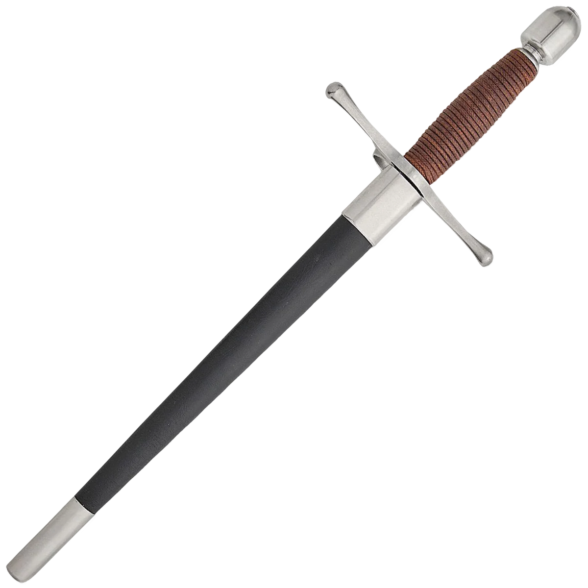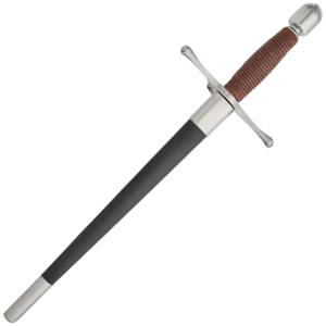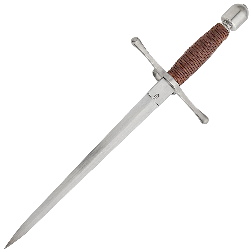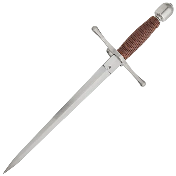 The Main Gauche, or left hand dagger, was often used with the rapier, providing an added dimension in both offense and defense, and the “Schools of Fence” which proliferated in Europe during this period taught the use of the two weapons in combination. The Main Gauche would often match the Rapier in styling, while incorporating features which maximized the effectiveness of the piece. The black titanium coated stainless steel guard and pommel are matte finished. The brown cord wrapped grip is comfortable in the hand and leaves enough space to wear fencing gloves if desired. Weight: 13 oz Width at Guard: 0.85" Thickness at Guard: 5.3mm Thickness at Tip: 2.2mm
