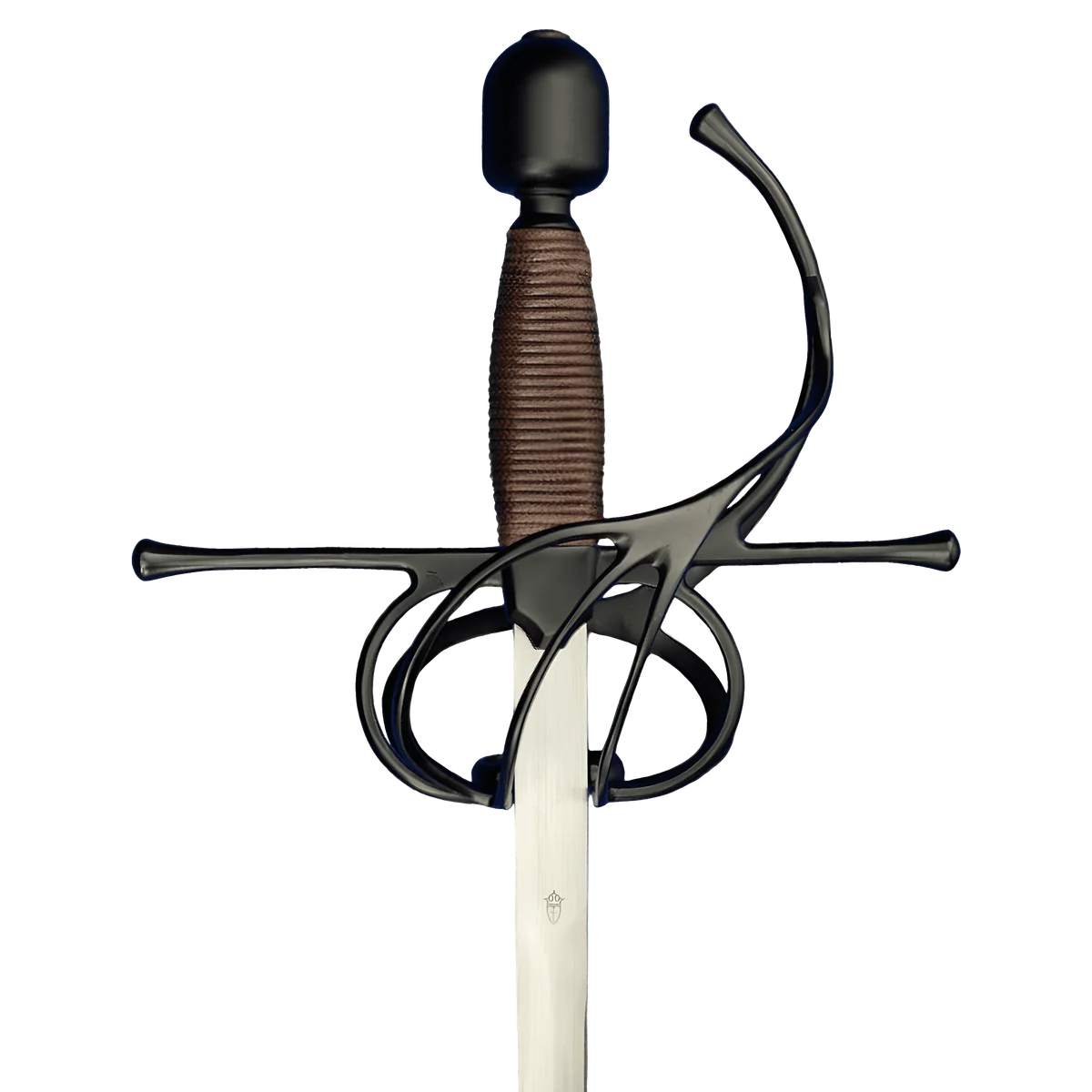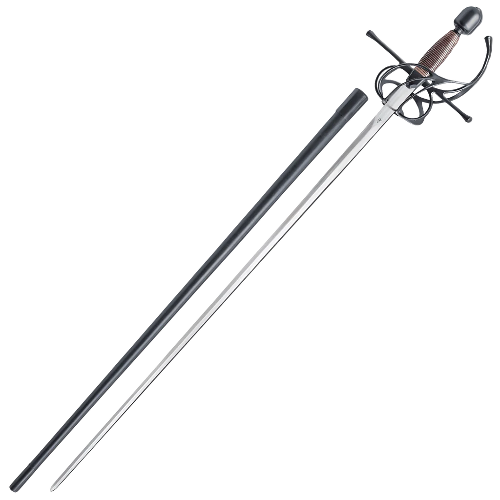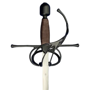 Renaissance-style rapiers trace their origins to early 17th century Europe, where swordplay with the rapier was considered an essential part of a gentleman’s education and was often used in resolving gentlemanly disagreements. Blades generally originated in one of the blade making centers such as Toledo or Solingen, but many differences in styling and hilt materials resulted from the local manufacture of hilts all over Europe. The Kingston Arms Rapier features improvements on the guard design where it joins the blade for more strength and reenforcement for the thrusts. The black titanium coated stainless steel guard and pommel are matte finished. The brown cord wrapped grip is comfortable in the hand and leaves enough space to wear fencing gloves if desired. Weight: 2 lbs Point of Balance: 2 5/8" Width at Guard: 0.75" Thickness at Guard: 5.5mm Thickness at Tip: 2.5mm