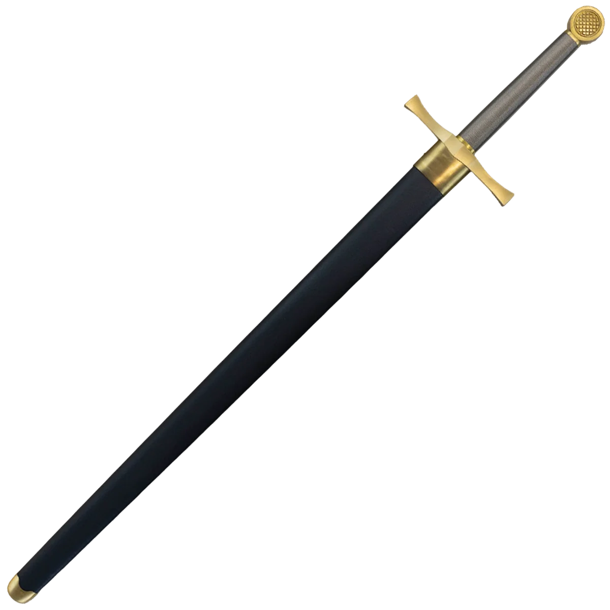 - A hardwood scabbard wrapped in leather with brass accents is included.