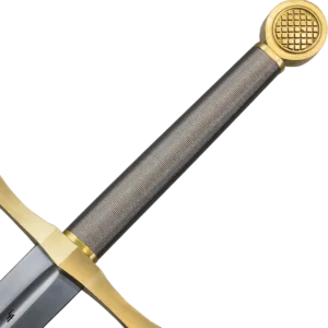 Excalibur – The legendary sword of King Arthur son of Uther and Igrain. The Legend has it that it was magically embedded in a stone and only the truest of knights could remove it and be king. The new and refined Legacy Arms Excalibur Sword keeps all the accoutrements of the original but they have honed the specifications to where its a better balanced and usable sword. The blade is made of strong high carbon steel with a peened through tang. The handle is wood core with a beautiful stainless steel twisted wire wrapping. The new 8" wire grip has been greatly reduced in diameter and flattened (32mm x 21mm) for better and well-balanced handling. The cross guard and pommel are made of plated stainless steel to avoid corrosion. Point of Balance: 3 1/2", Width at Guard: 2", Thickness at Guard: 6mm, Thickness at Tip: 2mm