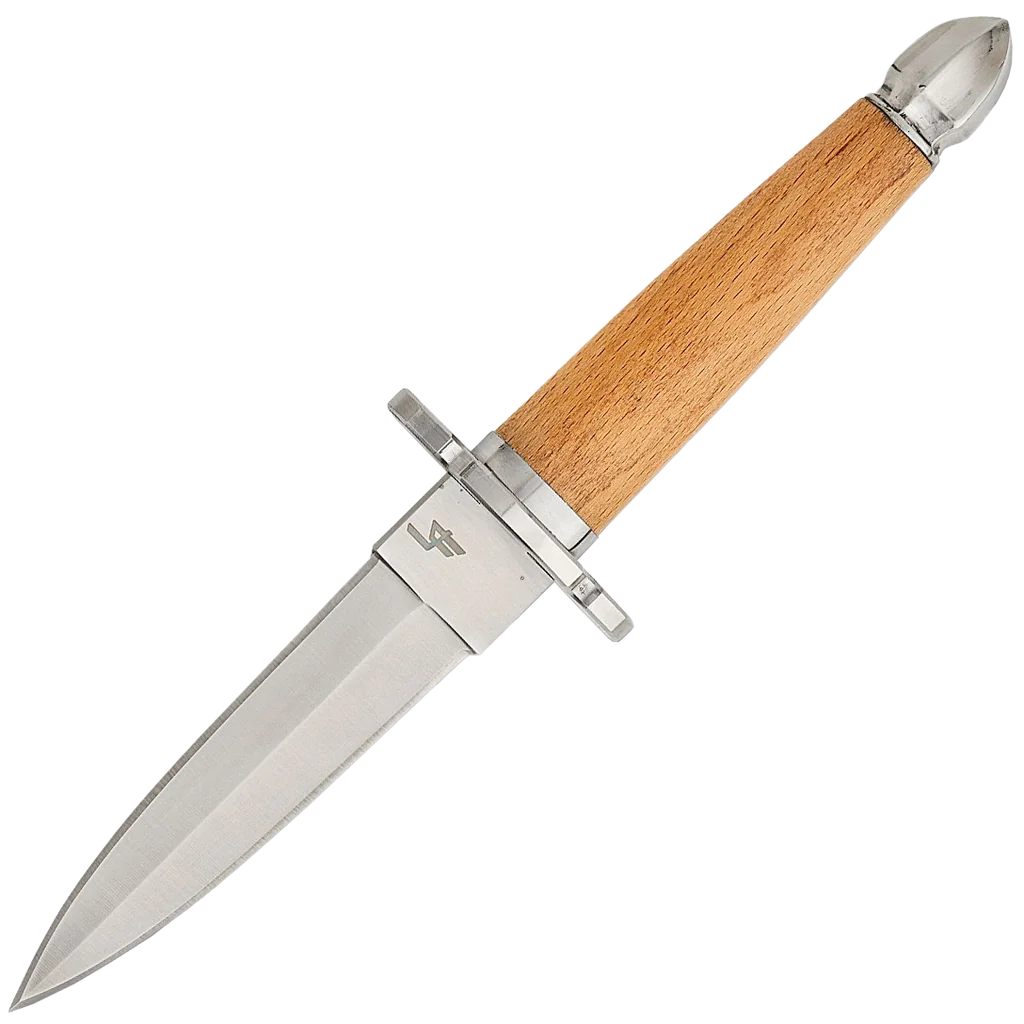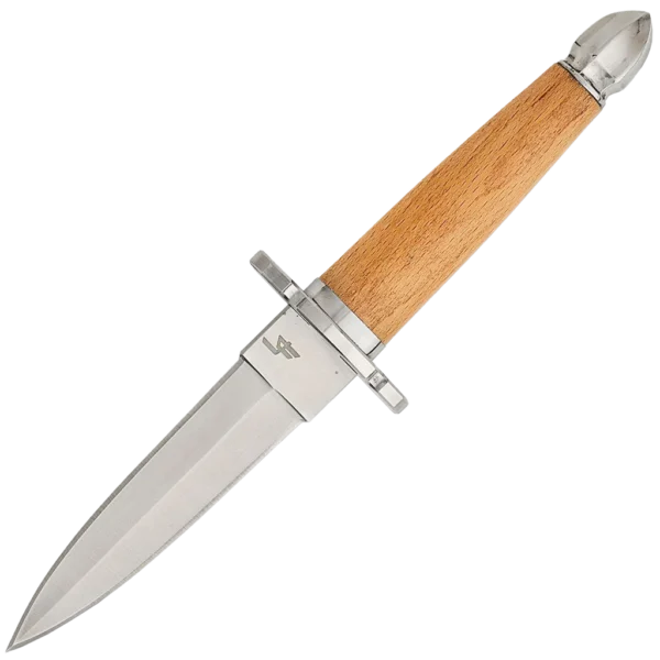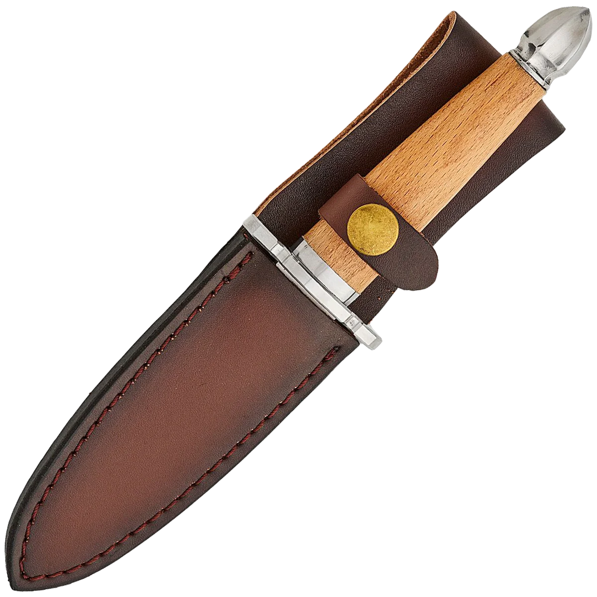 The Medieval Feast Knife is based on knives used during the Middle Ages in Europe and is designed for feasts or those unexpected tasks around the camp. This version is crafted from modern 5160 spring steel, a material known for its durability in cutting and strong resistance to rust. The blade is double-edged with a mid-rib for reinforcement.The handle is smooth wood with a small pommel and feels comfortable in the hand. It comes with its own sheath featuring a belt loop, keeping it safely tucked inside.