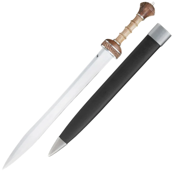 Most early versions of the Roman gladius were wasp-waisted with a long point that combined cutting and thrusting performance. Some later variants had a straighter blade while retaining a long point; even later patterns (such as the Pompeii) were not waisted and had a shorter point, remaining effective and simpler to produce. Both styles were used alongside one another for many years, and it was common for fourth-century legionaries to carry either model. The Roman Maintz Sword by Legacy Arms features a high-carbon blade, a hardwood handle and a high-polished steel spacer at the base of the handle for strength and durability. The sword includes a wooden scabbard wrapped in black leather with steel accents at the throat and tip.