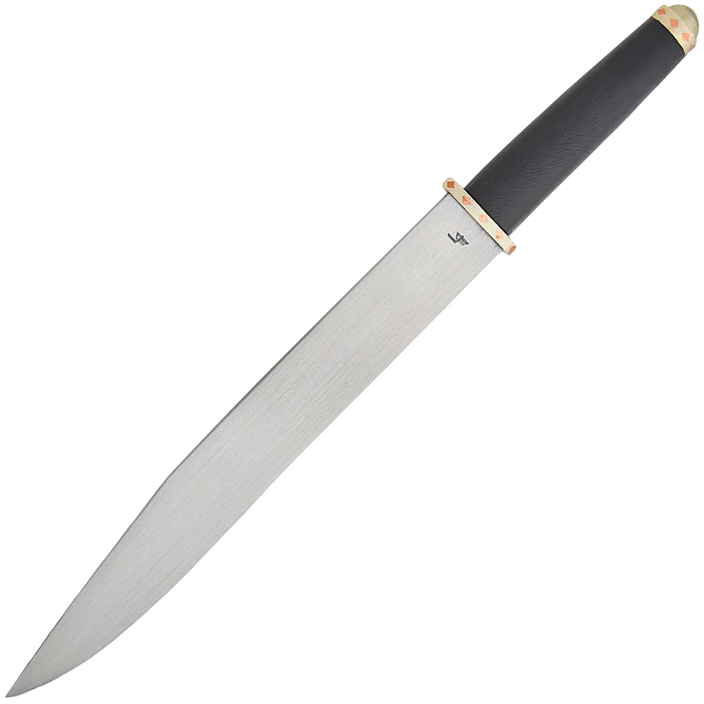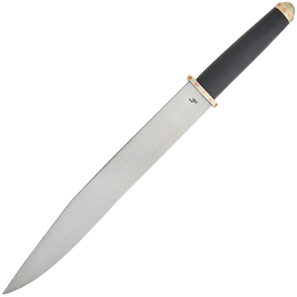 A scramseax (scramasax, or sometimes referred to as simply scram, seax or sax) was a type of Germanic single-edged knife. Scramseax seem to have been used for warfare and as a tool. They occur in a size range from 2.9" to 29.5". The larger ones (langseax) were probably weapons, while the smaller ones (hadseax) were tools, intermediate sized ones serving a dual purpose. Wearing a scramseax may have been indicative of freemanship. The scramseax was worn in a horizontal sheath at the front of the belt. Scram refers to food and seax to a blade (so, "food knife"). This Legacy Arms version is based off a 10th century style scramseax and features refinements like a reduced diameter in the leather handle for an easier grip. The tang is peened over the top of the metal end cap of the handle. A stiched leather brown scabbard with a belt hanger is included. Point of Balance: 2 1/2", Width at Guard: 1 3/8", Thickness at Guard: 5.5mm, Thickness at Tip: 1mm