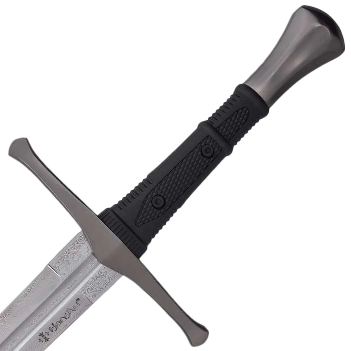 The Honshu Damascus Broadsword represents a modern spin on a proven, time-tested sword design with sleek, rugged tactical engineering and perfect blade-to-hilt balancing. It has a 33 3/8” Damascus steel blade that has a partial blood groove, which leads up to the hefty traditional handguard. The rugged TPR hilt gives you a no-slip grip and both handguard and pommel are satin-finished stainless steel. The 43 1/2” overall length broadsword fits securely in a black wooden scabbard that includes a leather belt hanger. Honshu continues to expand its exceptional sword line and this sleek, tactical broadsword is a must-have for your collection!
