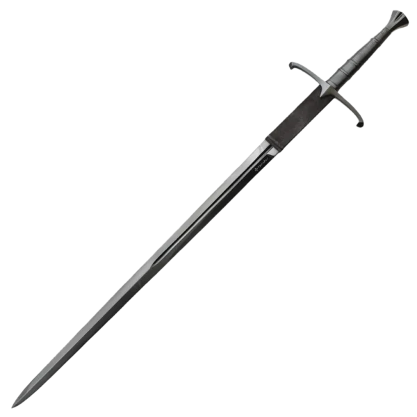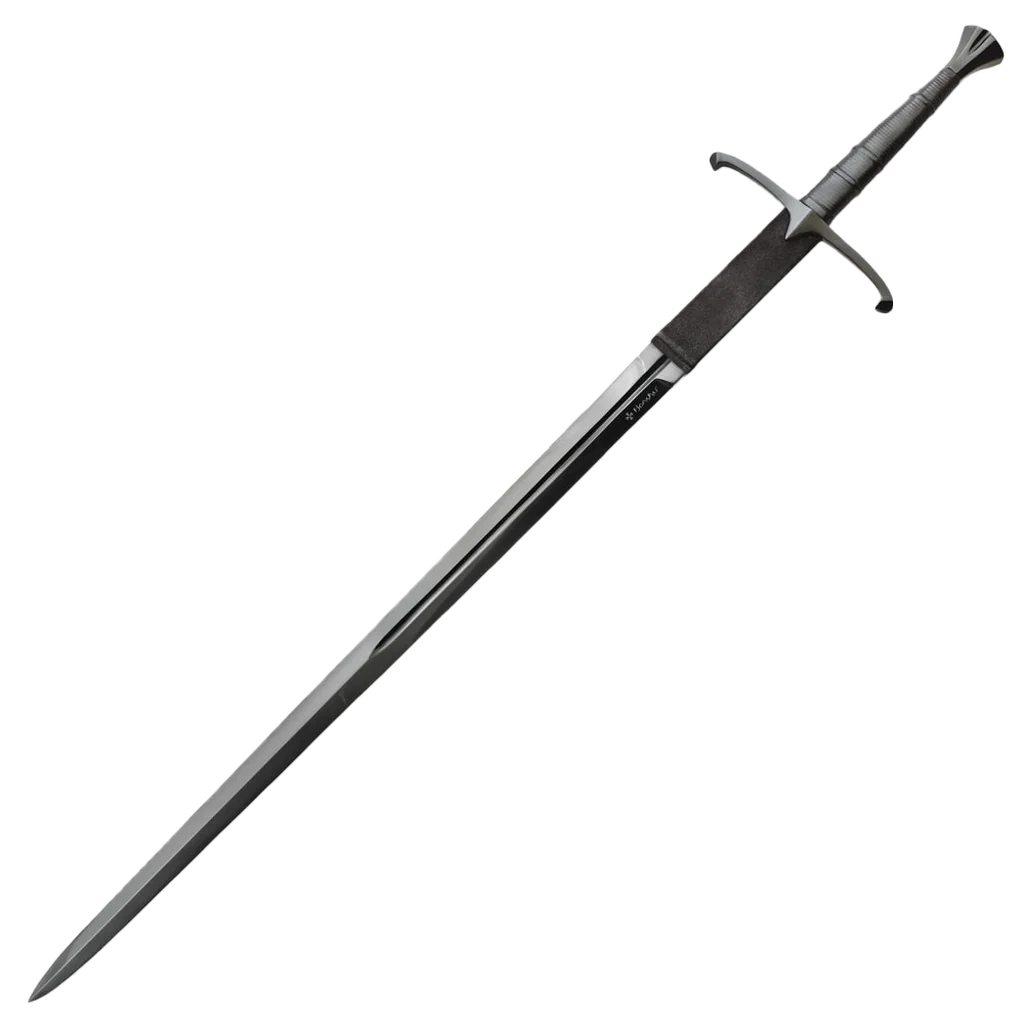 The Honshu Historic Black Claymore Sword And Scabbard is a time-tested sword design with modern engineering.The sword has a black 43 1/2” 1065 high carbon steel blade that has a deep blood-groove and has a genuine suede wrap below the dark steel handguard. The wooden handle is wrapped in genuine black leather with embossed cord grooves and the pommel is a dark steel. The 57” overall Claymore sword slides smoothly into a premium black leather scabbard with dark steel accents. Honshu continues to expand its exceptional sword line and this black, tactical Claymore sword is a must-have for your collection!