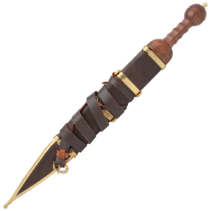 The Honshu Historic Forge Roman Mainz Pattern Gladius is a remarkable piece that transports you back to the days of ancient Rome. Crafted with meticulous attention to detail, this sword features an authentic Roman Mainz Pattern Gladius design, making it a must-have for historical enthusiasts and collectors. With a 20 1/4" Carbon Steel double-edged blade, this gladius is designed for exceptional cutting power. The wooden handle with a round pommel and grooved grip offers a comfortable and secure hold, allowing for optimal control and maneuverability. The leather wrapped scabbard with a strap and gold colored accents not only provides a protective casing for the gladius but also adds a touch of elegance and style to its overall appearance. It can be used for historical reenactments, or as a display item for enthusiasts who appreciate the rich history of ancient Rome. The exceptional craftsmanship, attention to detail, and historical accuracy make this gladius a valuable addition to any sword collection.