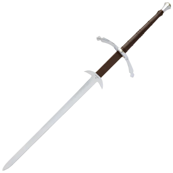 Elevate your collection with the new Honshu Historical Great Sword, designed for the true swordsman. Crafted with precision, this 55 1/2" masterpiece features a robust 33" blade forged from high-quality 1080 carbon steel, ensuring both durability and exceptional cutting power. Weighing 6.8lbs, this sword boasts remarkable balance, making it ideal for wielding over the shoulder. Take advantage of its versatile design, which includes a large guard with side rings and integral parrying hooks. These features enable closer-range sword techniques by allowing the blade to be choked up on, ensuring precise control during maneuvers. The dark brown leather-covered wooden handle offers a secure, full two-handed grip, enhancing maneuverability and control during use. Completing its design is a heavy steel pommel that serves to counterbalance the blade, providing enhanced stability.