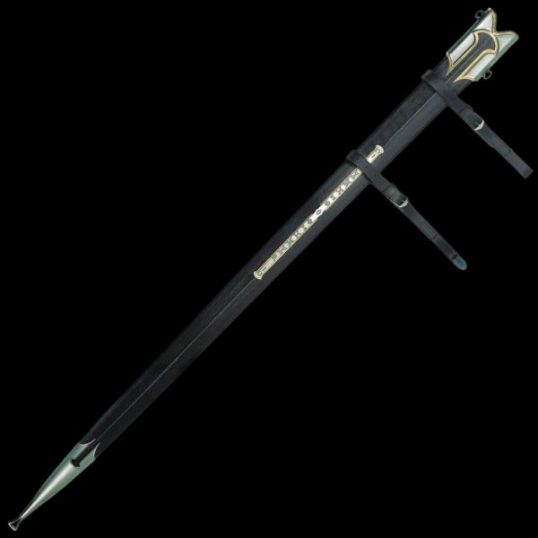 United Cutlery Brands, industry leader in fine movie knife and sword reproductions, has meticulously recreated the actual prop scabbard, using the finest grade materials and craftsmanship of the highest quality available. Anduril's scabbard is 44 5/8" overall and features genuine leather wrap and straps, solid metal collar, fittings, buckles, plate and tip with an antiqued metal and 24-K gold plated finish. The metal plate on the side of the scabbard is inscribed with the word Andúril, meaning "Flame of the West", in the Tolkien language of Quenya, written in the runes of Eregion and is bordered by the symbols of the sun and moon. King Elessar fastened his sword scabbard to his horse saddle so he could quickly draw the sword out for battle. This scabbard is designed to fit the Anduril Sword, the Limited Edition Anduril Sword ,and the Narsil Sword. Each sword is sold separately.
