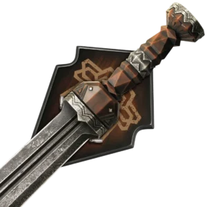 This replica of the Sword wielded by the dwarf Fili is a reproduction of the film prop used in The Hobbit. The blade is of AUS-6 stainless steel that has been antiqued for a battle-worn appearance. The fittings are of brushed, antique-finished steel and the handle is of hard acrylic. The sword comes with a wooden display plaque featuring a dwarven motif and a certificate of authenticity. Mounting hardware is included. This authentically detailed replica is a reproduction of the actual filming prop built by Weta Workshop of New Zealand and used in the motion picture, THE HOBBIT: AN UNEXPECTED JOURNEY. United Cutlery, industry leader in fine movie reproductions, has meticulously recreated the prop using only the finest grade materials and craftsmanship. Close attention to detail is a top priority.