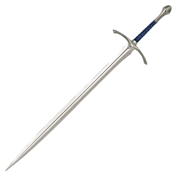 With over 100 million copies sold in over 40 languages, millions have grown up with The Lord of the Rings, the classic epic tale considered by millions to be the greatest fantasy-adventure story ever told. J.R.R. Tolkiens phenomenal epic trilogy chronicles the struggle between good and evil for possession of a magical ring. The book trilogy, named the most popular book of the 20th Century, has been presented in a series of feature films from New Line Cinema. Solid metal guard and pommel, antique metal finish. Genuine leather-wrapped grip. 420 stainless steel blade, false-edged. Wood display plaque. Plaque:10" X 16-1/2" X 5/8" wood. Wood grain finish with silk-screened designs. Certificate of authenticity. 47 5/8" overall. 35 1/4" blade.