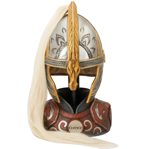 Éomer was a captain of the king’s cavalry, Marshal of the Mark, and one of Rohan's mightiest warriors. He bravely fought alongside King Theoden against the forces of Mordor at the battle of Helm's Deep and on the Pelennor Fields, skillfully wielding his sword, Gúthwinë, and hurling his great spear. He was recognized by his kinsmen on the battlefield by the long flowing horse tail that crested his great helm. This authentically detailed replica is a reproduction of the actual filming prop built by Weta Workshop and used in "The Lord Of The Rings" films presented by New Line Cinema. The helm is crafted of reinforced polyresin and genuine leather, with precisely-molded details and coloring. The horse hair crest is synthetic horse hair.