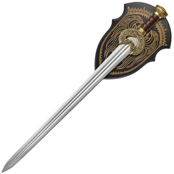This new Battle Forged edition of the popular Herugrim sword from The Lord of the Ringsâ„¢ films is made in the traditional manner with a full tang, tempered 1070 high carbon steel blade (false edged), and lost wax cast hilt parts. The blade features a double fuller and a full tang that is peened through the pommel, just like the real-steel hero filming props. The hilt features a solid brass guard and pommel with fine detailing and an aged and worn finish. The genuine leather-wrapped grip is shaped from real wood. Herugrim comes with a black and gold wood wall display and a certificate of authenticity.