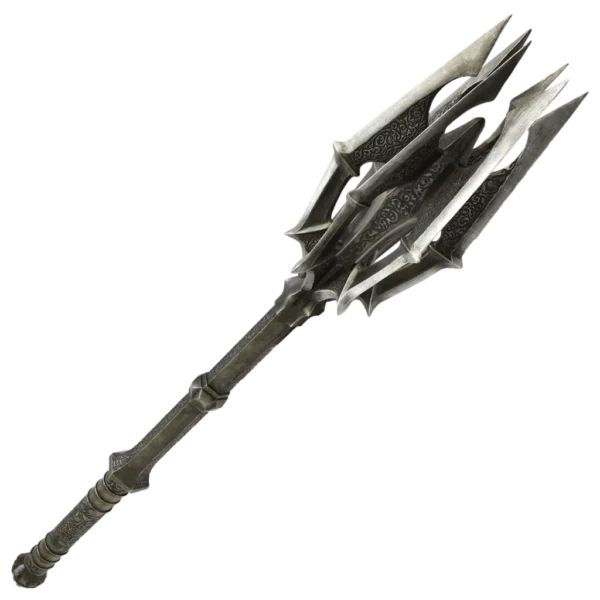A replica of the massive mace wielded by the Dark Lord Sauron in the prologue of The Lord of the Rings: The Fellowship of the Ring. When Sauron's forces battled the Last Alliance of Elves and Men on the slopes of Mount Doom, Sauron emerged on the battlefield wearing blackened steel armor. In one iron gauntlet he held a massive six-bladed, black iron war mace. On one finger he wore the source of his power, The One Ring. With every swing of this terrible weapon Sauron crushed his foes, sending intimidation and fear throughout the ranks of all who would stand against him. This replica of the actor scale prop used in the movie is crafted of reinforced fiberglass-resin with an aged iron finish. Close attention to detail is a top priority in every piece, down to the intaglio-etched surface and corroded metal colouring. The oversized One Ring worn by Sauron is also included, crafted in gold plated solid metal. Displays on a polystone wall mount (mounting hardware and instructions included).