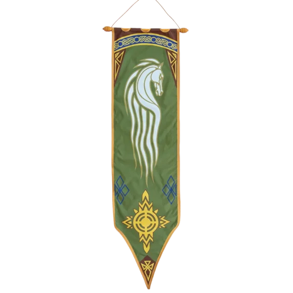 Embrace the legacy of Middle-earth with this officially licensed Lord of the Rings Rohan Banner, a striking tribute to the horse-lords of Rohan. Made from durable nylon cloth, the banner is designed for longevity and features the iconic horse and sun motif that symbolizes the Rohirrim's deep connection to their beloved steeds. Measuring an impressive 65 7/8" in length and 16" in width, it arrives ready to display with an elegant wooden hanging rod. Rohan’s culture, built on the breeding and trading of horses, is captured in every detail of this banner, making it a must-have piece for fans of Tolkien’s world. Perfect for collectors and enthusiasts alike, it adds a touch of the noble kingdom of Rohan to any home or collection.