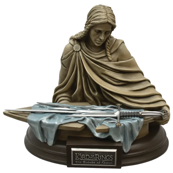Narsilâ„¢ is perhaps the most famous sword in The Lord of the Rings trilogy. A great battle was fought against Sauronâ„¢ at the end of the Second Age of Middle-earth, the Last Alliance of Elves and Men. Narsil's blade was shattered by Sauron as Elendil fell, creating the Shards of Narsil. The Shards were kept in Rivendell, the house of Elrondâ„¢, for safe keeping. Legend tells that the sword would one day be re-forged and the king would return. The 1/5 scale miniature Shards of Narsil are presented with a hand-painted cold cast polyresin statue of an Eleven Princess cradling a shield that the removable shards lay upon. This updated true color version reflects the actual tan color of the stone statue and blue velvet cloth rather than the blue stone and silver cloth colors from the previous version.