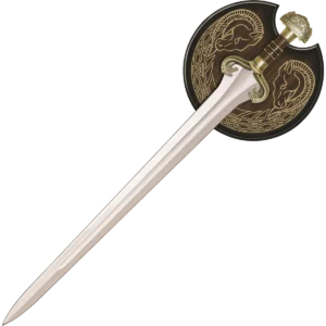 This full-sized sword, which measures nearly three feet in length, from tip to hilt is styled beautifully with a bronze guard and pommel. The handgrip was crafted with a raised middle section of three bronze rings. A wide fuller groove runs down 3/4 of the blade to reduce the weight, yet still retain critical blade strength. Eowyn achieved true heroism as she succeeded in the slaying of the Witch King and his fell steed. Constructed with a 30 1/8" tempered 420 J2 stainless steel blade. The handle features a solid metal guard and pommel with antiqued brass plated finish, the hilts are cast in the symbols of the famed horsed of Rohan and the grip is genuine leather wrapped. 36 1/2" overall