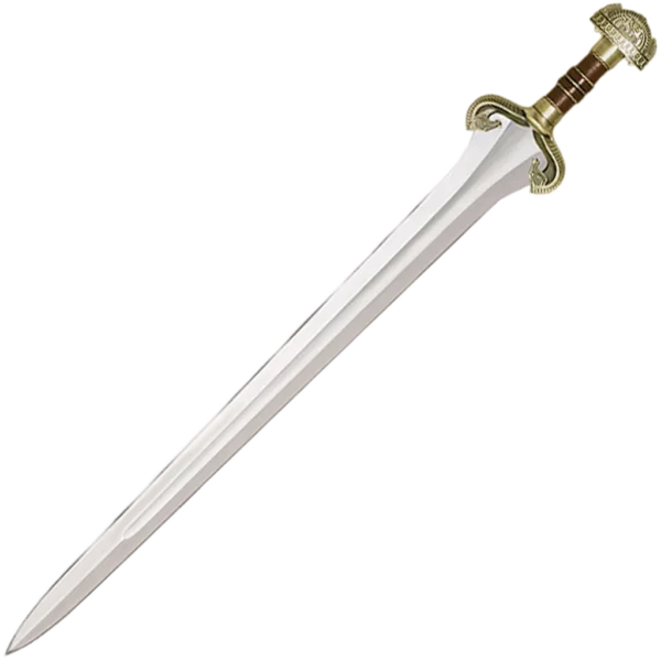 This full-sized sword, which measures nearly three feet in length, from tip to hilt is styled beautifully with a bronze guard and pommel. The handgrip was crafted with a raised middle section of three bronze rings. A wide fuller groove runs down 3/4 of the blade to reduce the weight, yet still retain critical blade strength. Eowyn achieved true heroism as she succeeded in the slaying of the Witch King and his fell steed. Constructed with a 30 1/8" tempered 420 J2 stainless steel blade. The handle features a solid metal guard and pommel with antiqued brass plated finish, the hilts are cast in the symbols of the famed horsed of Rohan and the grip is genuine leather wrapped. 36 1/2" overall