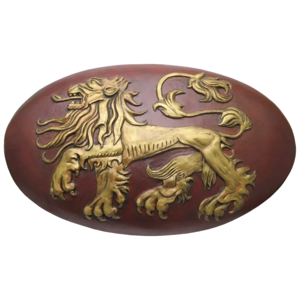 The wealthiest family in Westeros, the Lannisters of Casterly Rock ruled as kings in their realm until the Targaryen dragons conquered the continent. Cersei Lannister’s marriage to King Robert Baratheon brought the family to King’s Landing; and her son Joffrey’s ascendance to the Iron Throne solidified their power. This adult collectible is officially licensed from HBO's hit series "Game of Thrones” and is a limited edition of 1000 pieces. Each shield is individually serialized and will come with a certificate of authenticity. The shield is crafted from painted fiberglass and resin and backed with black felt, as well as two sets of leather straps so that it can be worn on the arm or across the back. The shield comes with a black wooden wall mount that not only allows for it to mounted to the wall, but can also be configured to be displayed with up to three additional swords. Mounting hardware included.