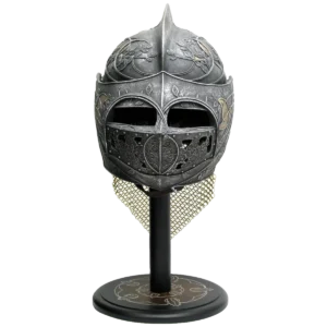 Ser Loras Tyrell, also known as the Knight of Flowers, is a knight of House Tyrell and the third son of Lord Mace Tyrell of Highgarden and his wife, Lady Alerie Hightower. Loras is a highly skilled knight and jouster. Loras purchased his armor from Tobho Mott's shop in the Street of Steel in King's Landing. During the tourney on Prince Joffrey's name day in 298 AC, Loras defeated Ser Hosteen Frey and Ser Jaime Lannister of the Kingsguard in the joust. This helm, like his armor, epitomizes his character and flair for style and martial skill. The Helm of Loras Tyrell is an officially licensed Game of Thrones collectible and limited to a production run of 1000. The helm is crafted in lightweight fiberglass to make it lighter and more wearable. It is finished for an antiqued steel and bronze appearance. Attached to the helmet is a beautiful aventail of golden brass chainmail rings. It has a hinged visor and a hinged faceplate – the tension of these pieces can be adjusted by use of an internal allen screw. The interior of the helm is lined with fabric coated padding. The lower faceplate is lined with soft brown leather and has a brass plate etched with the production number. spacer The Helm comes with a wooden stand silk-screened with the sigil of House Tyrell. Stand hardware included. Also comes with a Certificate of Authenticity.