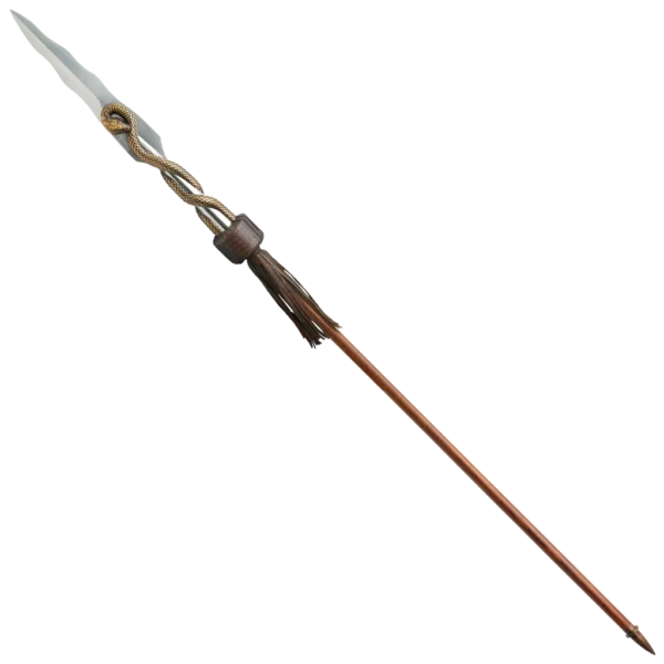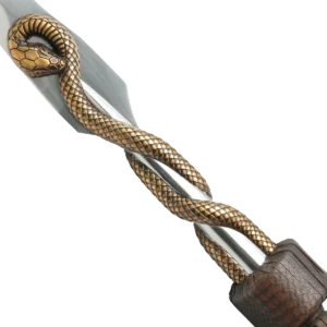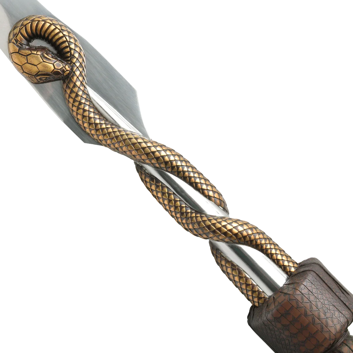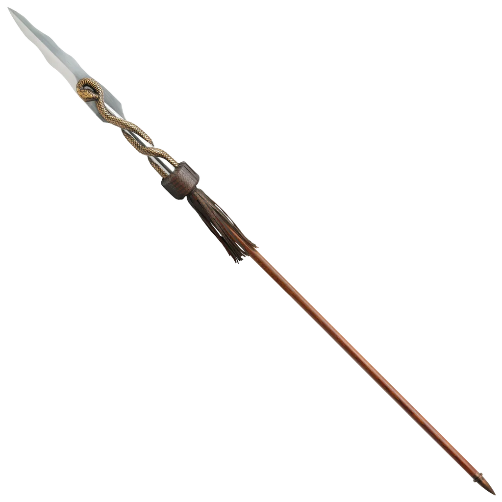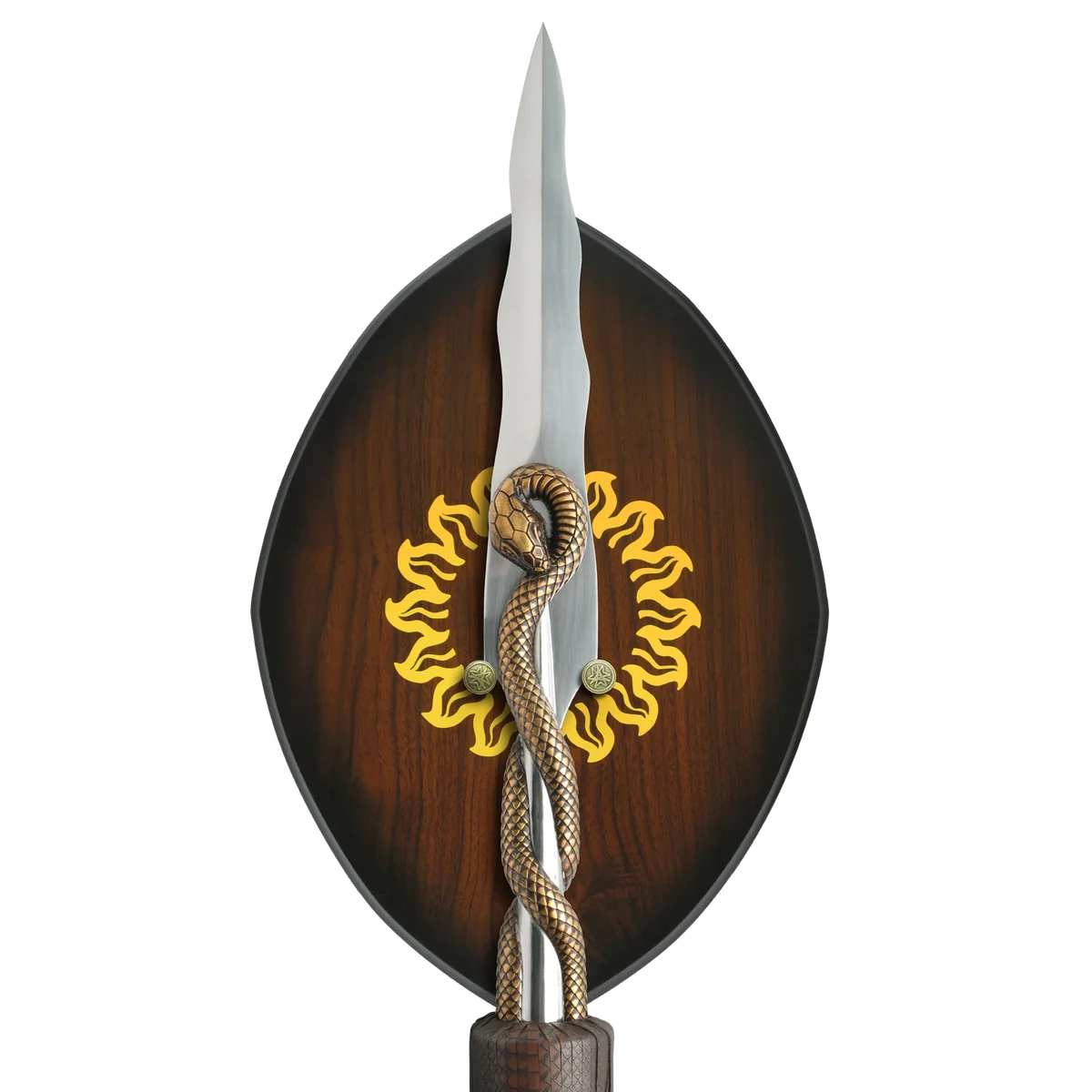 His spear in hand, it was clear to any who witnessed him in battle or duel why Oberyn Martell was the Red Viper – like a serpent himself he fought, his spear deftly moving from all manner of deceptive and dizzying angles to goad the opponent into an anticipated attack. Then, quick like the serpents strike the spear would find its mark and the piercing bite from the venom-clad blade would lay low the foe. Reproduced here is the officially licensed spear of Oberyn Martell from HBO's Game of Thrones. The blade is stainless steel which is polished to a reflective mirror finish and adorned with a sinuous serpent on both sides with an antiqued, copper finish. The spear shaft is wood and a cap of antiqued metal with a bronze finish is fitted to the shaft end. The spear is finished with a tassel of faux snakeskin leather. Included with the spear is a screen-printed wall mount display plaque of wood which is emblazoned with the sigil of House Martell. Mounting hardware is included