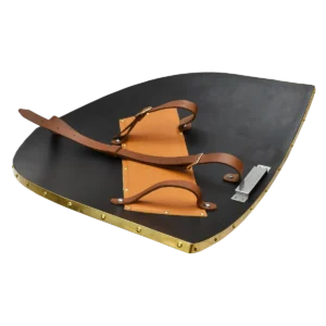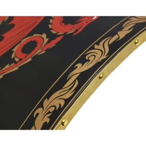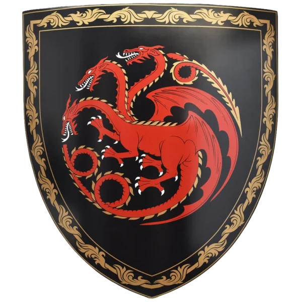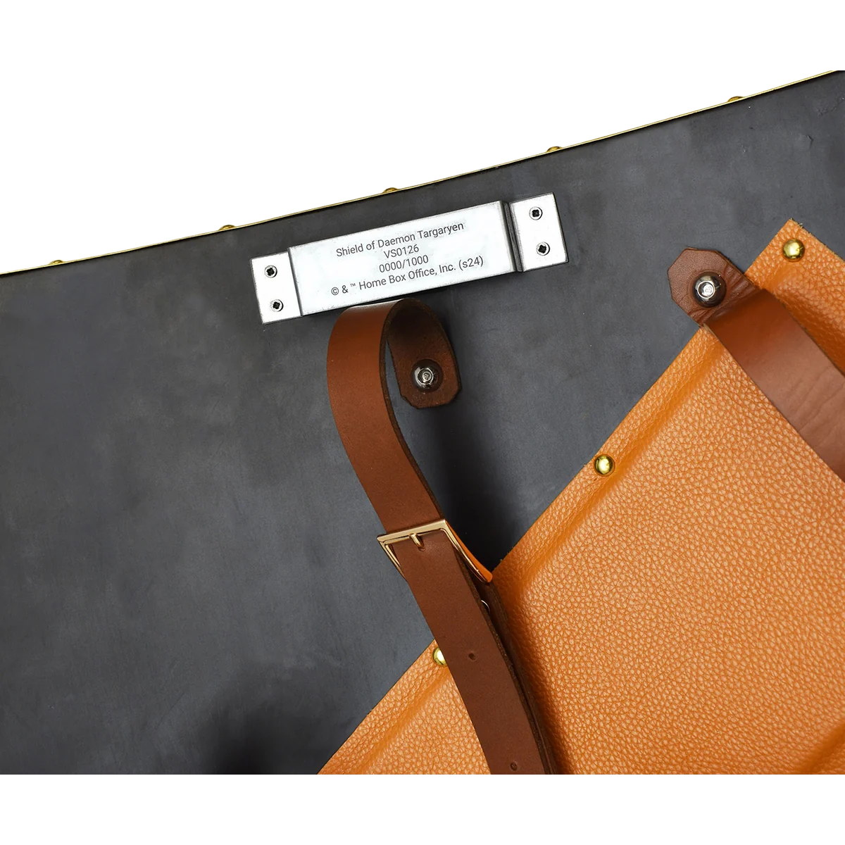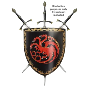 Introducing the Shield of Daemon Targaryen, an officially licensed masterpiece from HBO®'s House of the Dragon®. Crafted with canvas-wrapped wood, brass trim, and genuine wood straps, this limited-edition shield not only captures the essence of Targaryen heritage but also features a versatile wall mount to display up to three swords. With only 1000 pieces available, each accompanied by a certificate of authenticity, this is a must-have for any true fan of Game of Thrones ® or House of the Dragon ®. • Own a Piece of History – Display a meticulously crafted shield with authentic materials and intricate detailing, making it a must-have for die-hard House of the Dragon® enthusiasts. • Elevate Your Collection – This limited edition shield, complete with a certificate of authenticity, adds unparalleled value and prestige to your memorabilia collection. • Showcase with Pride – Easily mount your shield and up to three swords on your wall, transforming any space into a tribute to the Targaryen legacy. • True Authenticity – Not only is this the only officially licensed Targaryen shield authorized by HBO®, the canvas and wood construction is historically accurate and authentic to the time period of the story. Be one of only 1000 lucky owners with this exclusive shield of Daemon Targaryen. Add this stunning shield to your collection today! This item is a collectible reproduction. This replica shield is intended solely for display purposes as a collector's item. Official HBO Licensed Product © 2024 Home Box Office, Inc. All Rights Reserved. HOUSE OF THE DRAGON and all related characters and elements © & â„¢ Home Box Office, Inc. (s24). Produced under License by Jalic Inc.