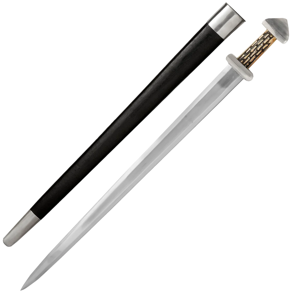 An impressively authentic replica of a Viking sword dating from around 900 AD. This hefty blade has a classic triangle style pommel and faux antler grip; a design inspired from the 10th Century replicating the typical Vikings swords of the time. The sleek blade comes complete with a black scabbard with steel fittings. The Vikings prized their swords above all other things. Typical Viking swords had fine blades, long, slightly tapering and double-edged – usually with a fuller running down the length. Sword hilts ranged from plain and robust to highly decorated and artistic.
