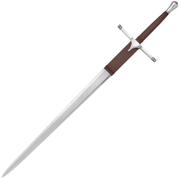 There are a number of swords that traditionally have been linked to heroic Scottish leaders like William Wallace or Robert the Bruce. When such swords are examined it becomes apparent that they are to be placed more in the 16th century period than in the early 1300s. Swords of a large size were considered fitting weapons to have been used by such heroes and in history certain swords became associated with these leaders. The most likely sword type being used by William Wallace during the wars of Scottish independence may have shown some of the features found on swords of a century or so later. It would be fair to assume that langlets may have been present on a fairly substantial cross-hilt and there would likely have been terminals to the quillions of some shape or another. The pommel could have been wheel shaped, spherical or pear shaped. In a duel a knight would select a plain robust sword of high quality-Wallace would have been no exception to this rule.