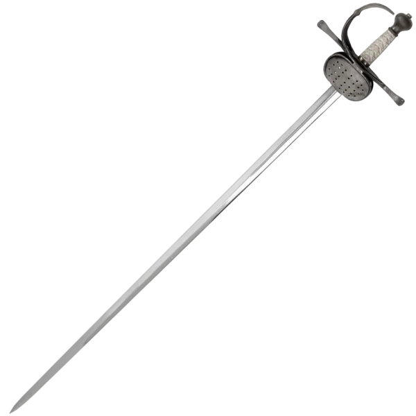 This is a John Barnett designed Museum-Quality Replica Pappenheimer Rapier, the Rapier became the weapon of choice for the civilian gentry but the military never fully adopted it except as a dress sword. However, it was obvious the hand protection of the new sword afforded was something that would be useful in battle. Since armour was in decline at this point, blades could be slimmer so sword designers conjured up a new idea, a rapier style guard with a blade somewhere between a rapier and a cutting sword. The Pappenheimer Rapier was the choice of many, it was light, flexible, capable of both cut and thrust and yet not too heavy for good point work.