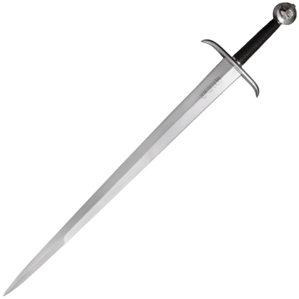 This is a John Barnett replica broadsword of Owain Glendower. The Welsh national leader Owen Glendower (1359 -1415) led Welsh opposition to English rule during the early 1400s. Glendower headed a Welsh rebellion in 1399, and, after being captured at Flint Castle, he was pardoned, but some of his lands were not restored to him. After an unsuccessful appeal to Parliament, Glendower turned to rebellion and in 1400 took the title of Prince of Wales. This sword features a pommel with the Welsh Dragon engraved in the centre. The grip is wrapped in narrow strips of faux leather, with straight cross guard with slightly upturned quillions. The long tapered blade features the Glyndwr name engraved at the base.